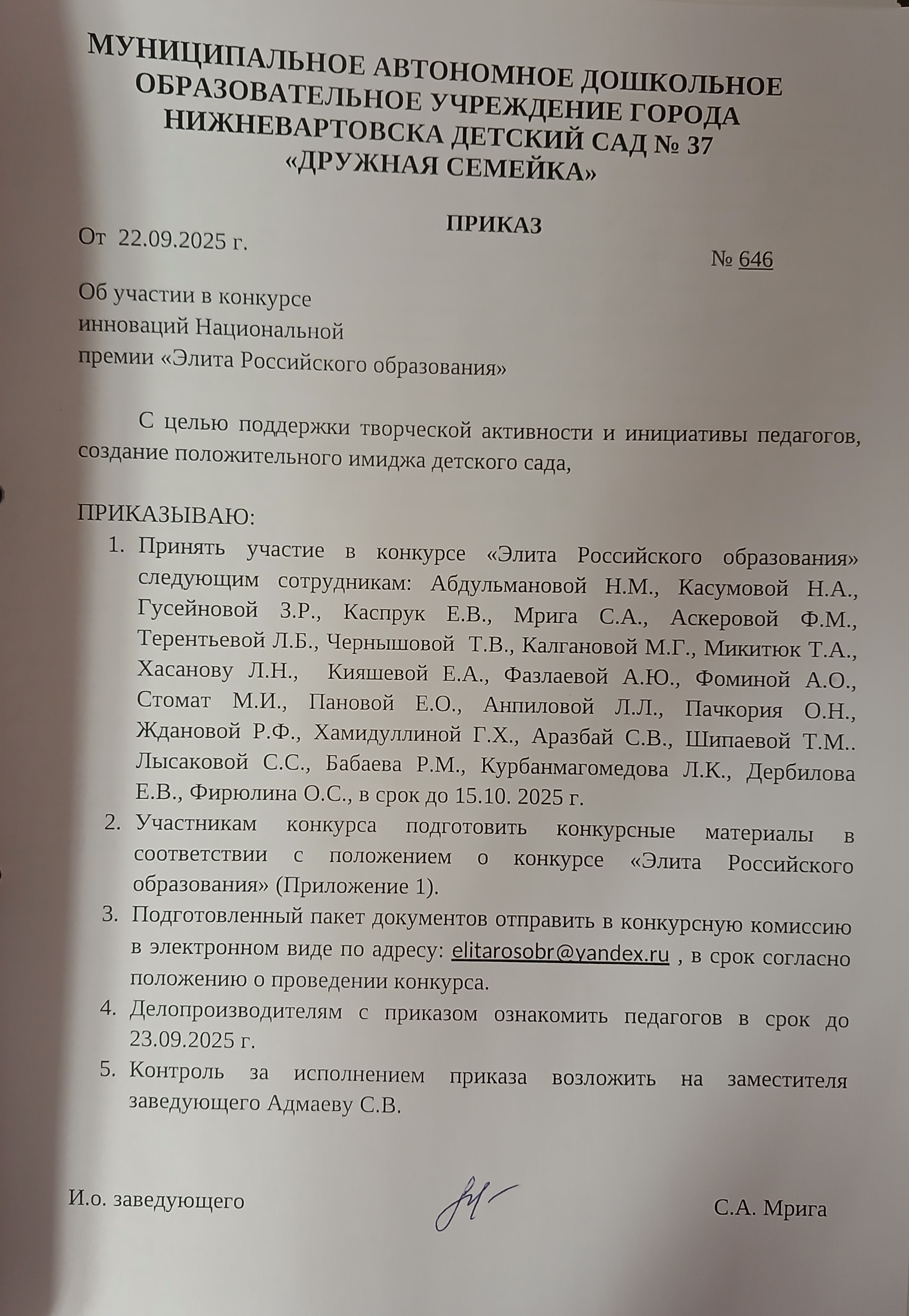 Приказ №646 от 22.09.2025 г. "Об участии в конкурсе инноваций "Национальной премии "Элита Российского образования" (Просмотр)
