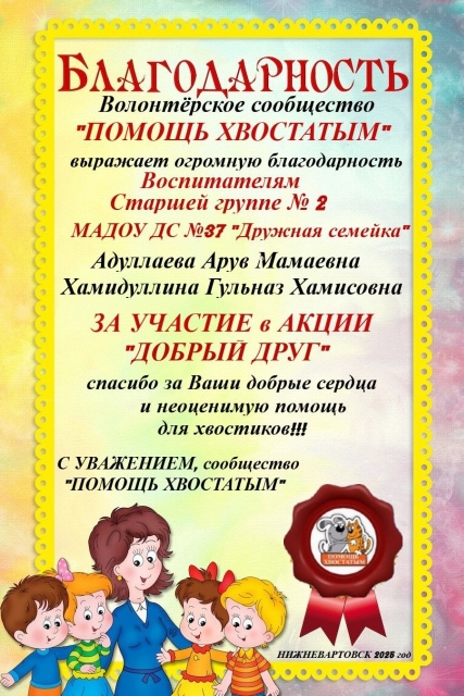 Благодарность волонтерского сообщества"Помощь хвостатым" за участие в акции "Добрый друг" 2025 год (Просмотр)
