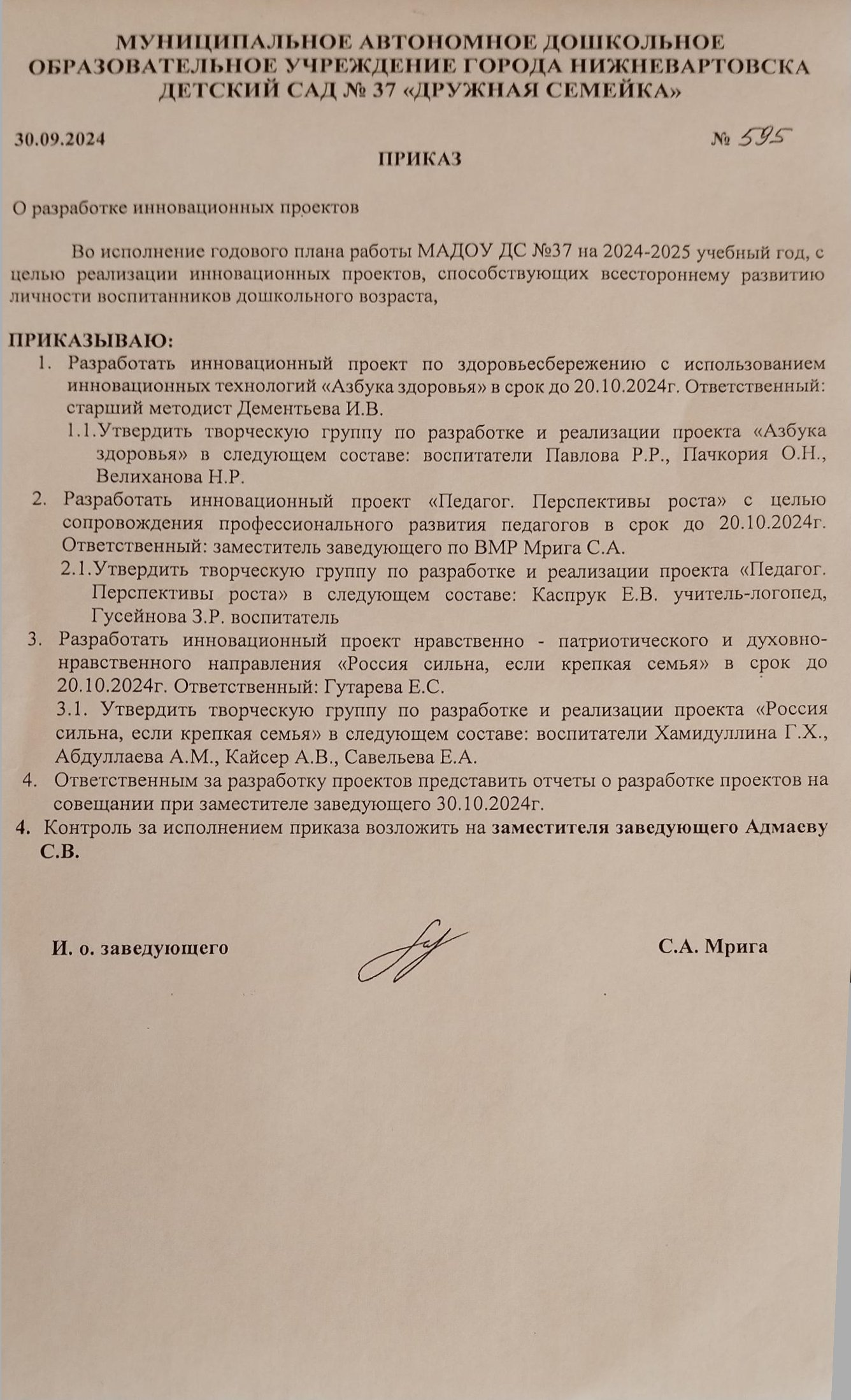 Приказ №595 от 30. 09 2024 г. "О разработке инновационных проектов "(Просмотр)