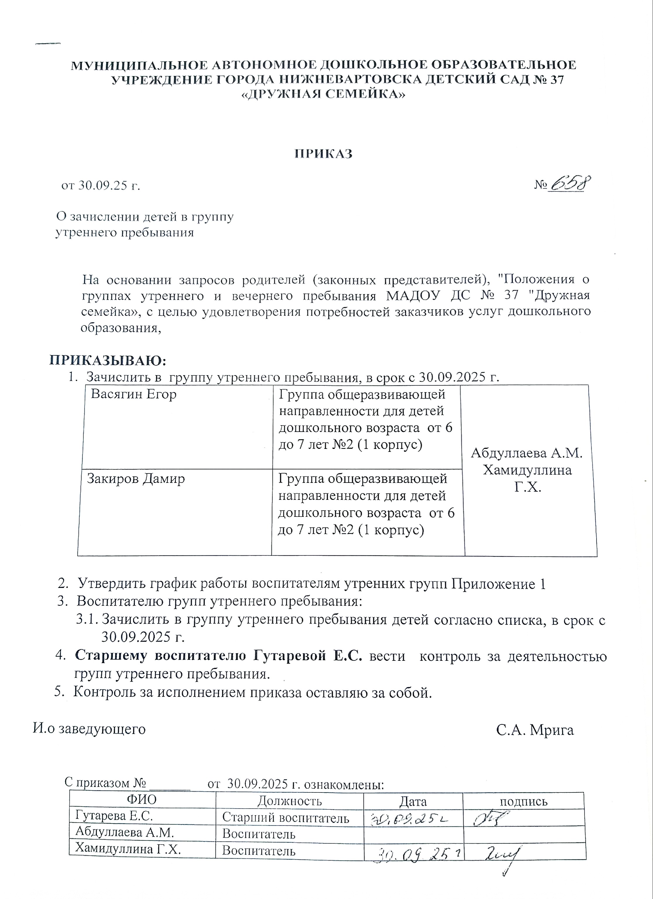 Приказ №658 от 30.09.2025 о зачислении детей в группу утреннего пребывания (Просмотр)