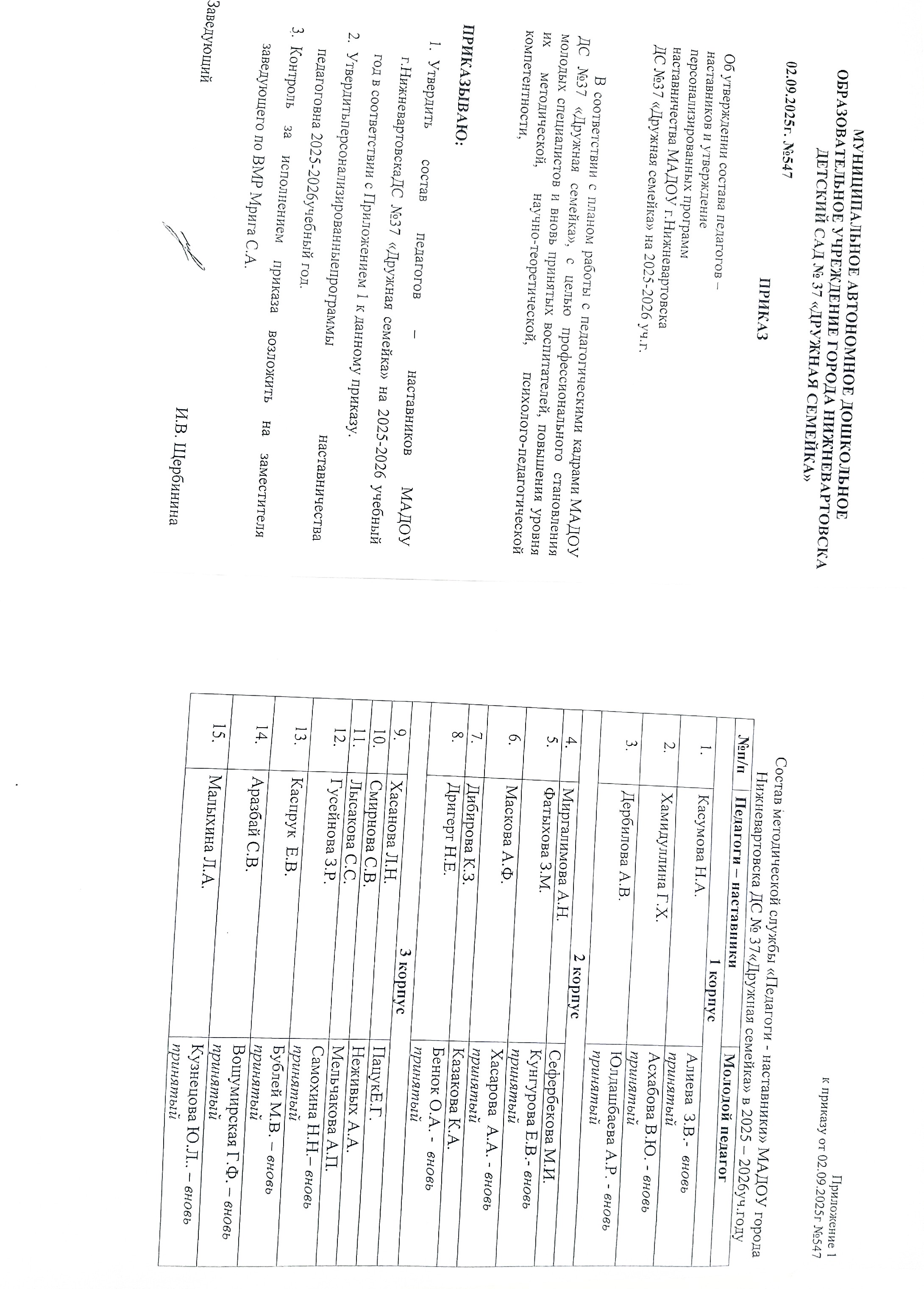 Приказ №547 от 02.09.2025 об утверждении состава педагогов наставников и утверждение программ наставничества МАДОУ г. Нижневартовска ДС №37 "Дружная семейка" на 2025-2026 уч.г.(Просмотр)