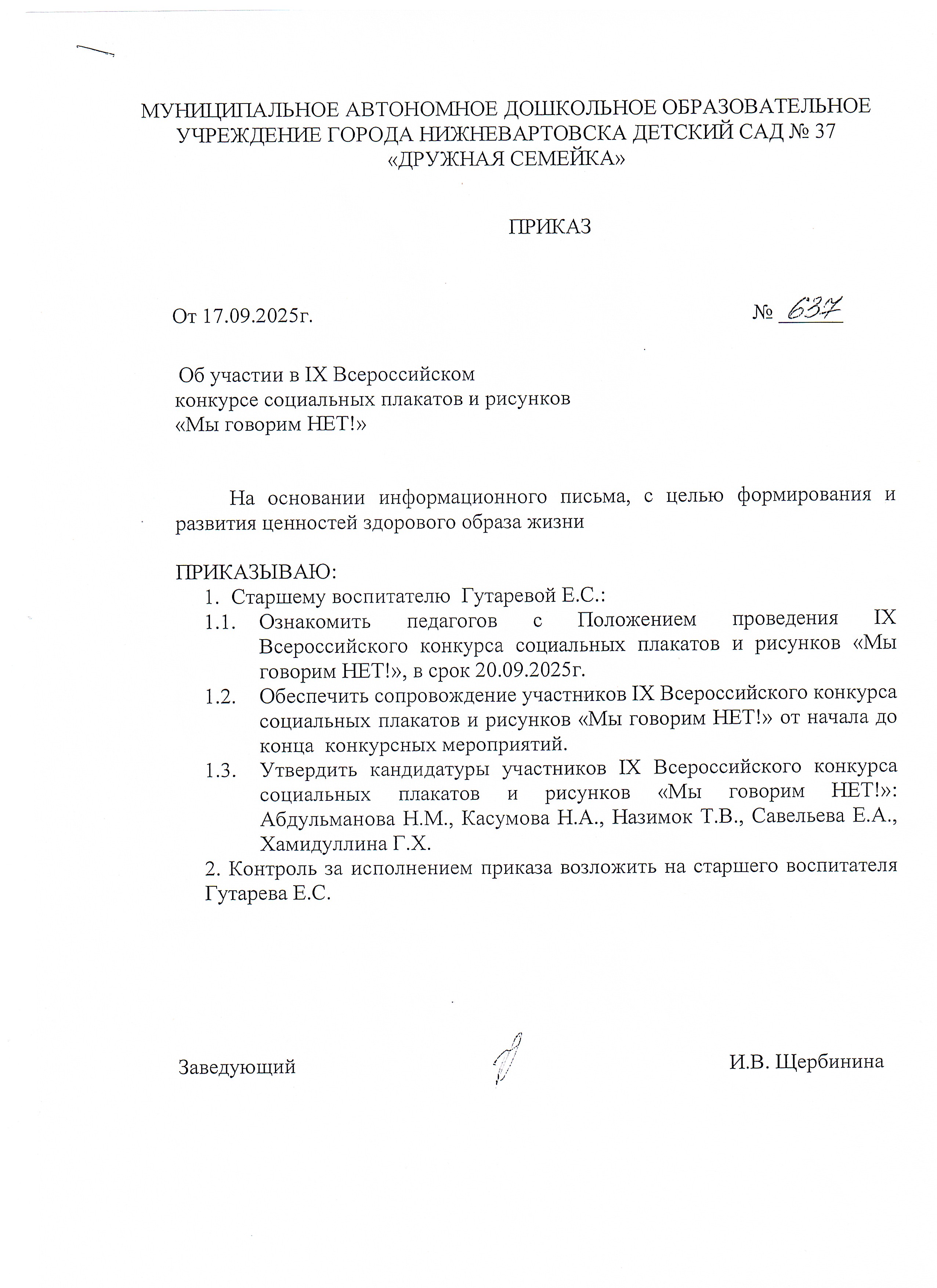Приказ № 637 от 17.09.2025 об участии во Всероссийском конкурсе социальных плакатов и рисунков "Мы говорим НЕТ!" (Просмотр)